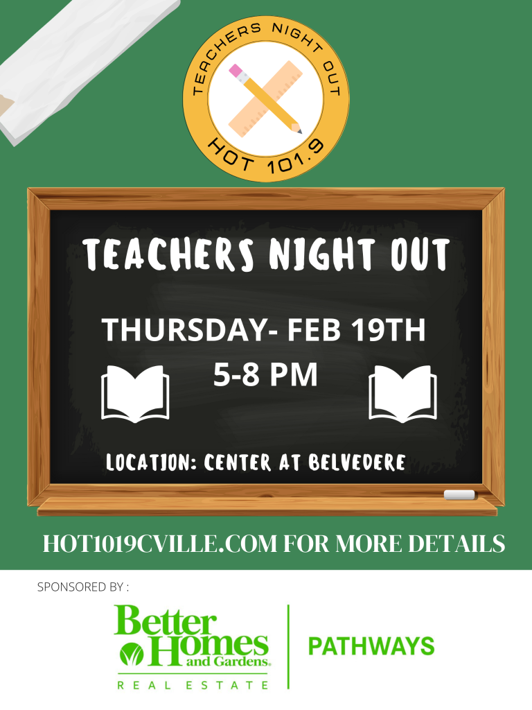 Teachers… class is officially dismissed! Hot 101.9 invites you to Teachers Night Out , Thursday, February 19th, from 5 to 8 PM at the Center at Belvedere! That means no lesson plans, no grading papers, just dinner from Outback Steakhouse , prizes galore, concert tickets, and laughs with your favorite co-workers.’ You give so much every day… so it’s our turn to teach a class on hospitality and fun!